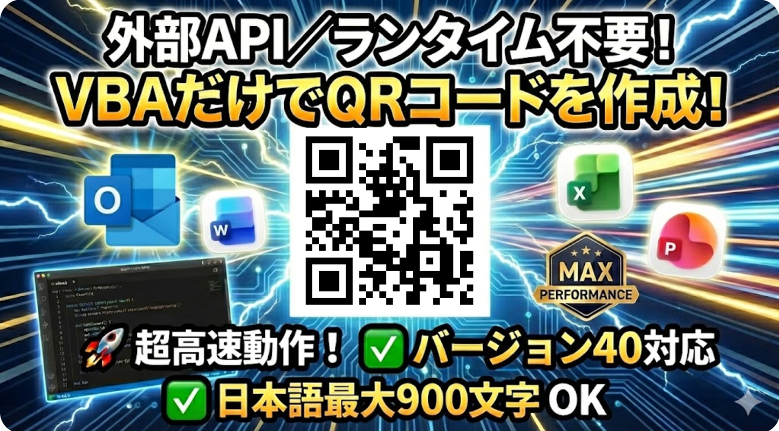 ここに至るまでは長い紆余曲折がありました。書いては実行、書いては実行、正常なQRが作成されない日々、いったいどこが悪いのか、核となる生成多項式が誤っているのか、はたまた画像作成GDI+でこけているのか、いやいやそもそもQRの仕様理解が足りていないのか、ChatGPTに聞いても一向に解決する兆しなし・・・2年に及ぶプログラミングバトルの結果、ついに完成したoutlookVBA(というか全Office共通VBA)コード、公開します!